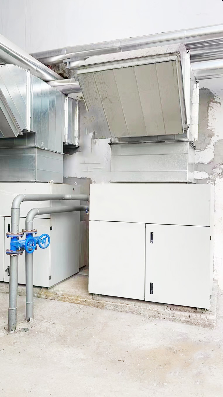 是将变频器的热风通过风道直接经过空-冷装置进行热交换,由交换器内部的冷却水管道与热空气进行非介质接触式交换,直接将变频器散失的热量带走,避免变频器对室内环境形成加热作用。空冷装置的供水压力在0.20~0.60mpa、冷水温度不大于33℃时,即可保证热风经过热交换器后,将变频器室内的环境温度控制在40℃以下。从而,保证了变频器室内良好的运行环境。同时,由于房间密闭,变频器利用室内的循环风进行设备冷却,具有粉尘浓度低,维护量小的特点;减少了环境对变频器功率柜、控制柜运行稳定性的不利影响。