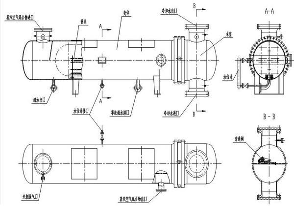 ③安装时应注意冷却水进出口位置,不得接反,冷却水进口位置与轴封汽进汽口位于同一侧,冷却水出水位置与喷射器位于同一侧。